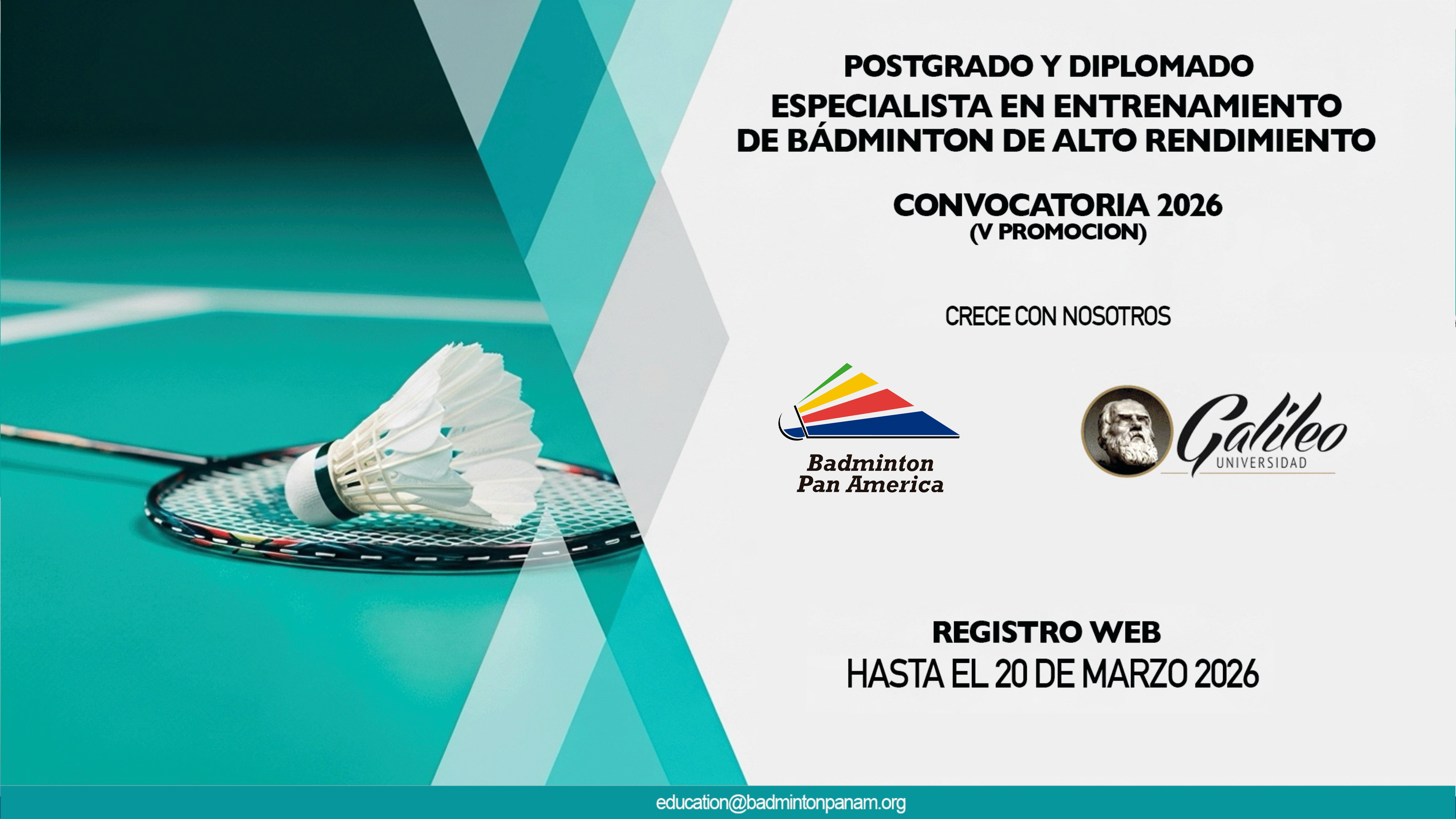 La Confederación Panamericana de Bádminton se complace en abrir un nuevo proceso de admisión para el Curso de Postgrado Especialista en el Entrenamiento de Bádminton de Alto Nivel, certificado por la Universidad Galileo de Guatemala.